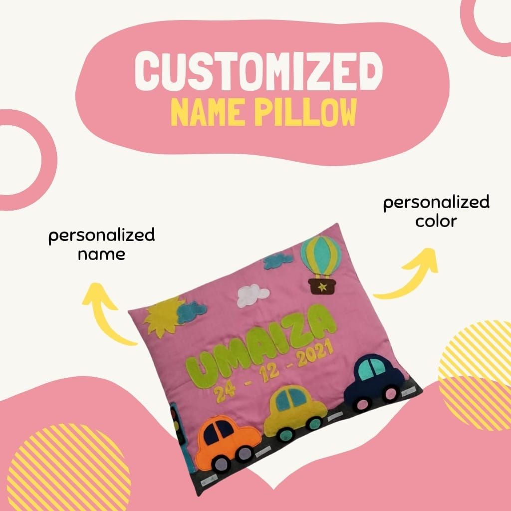 Add a personal touch to your child’s space with our handmade custom craft pillow – a perfect keepsake and decor piece in one. This beautifully detailed pillow features playful car motifs, whimsical clouds, and a charming hot air balloon. Each pillow is personalized with the child’s name and date of birth, making it a meaningful gift for birthdays, baby showers, or nursery decor. Crafted with love and soft materials, it's safe, cuddly, and completely unique – just like your little one.