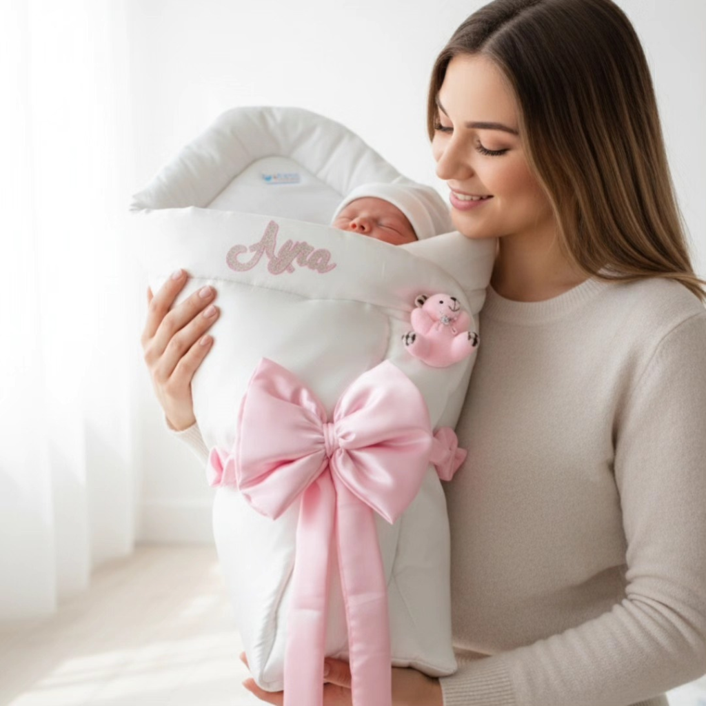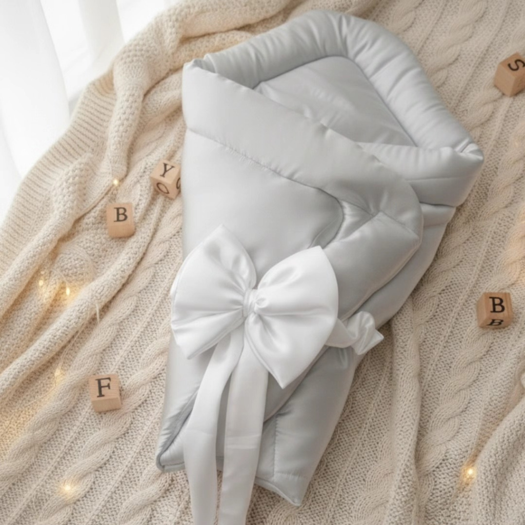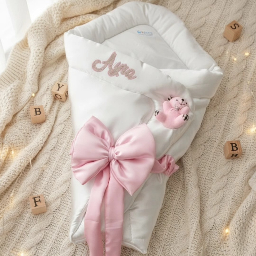 Experience ultimate luxury and comfort with our Customized Silk Fabric Carry Nest, designed to cradle your baby in softness. This premium sleeping bag features a quilted silk fabric construction and an elegant oversized white satin bow, ensuring both warmth and style. Personalize it with your choice of name and an optional bear motif for a unique touch. Ideal for keeping your little one cozy and secure, this carry nest makes a sophisticated addition to any nursery and a thoughtful gift for baby showers.