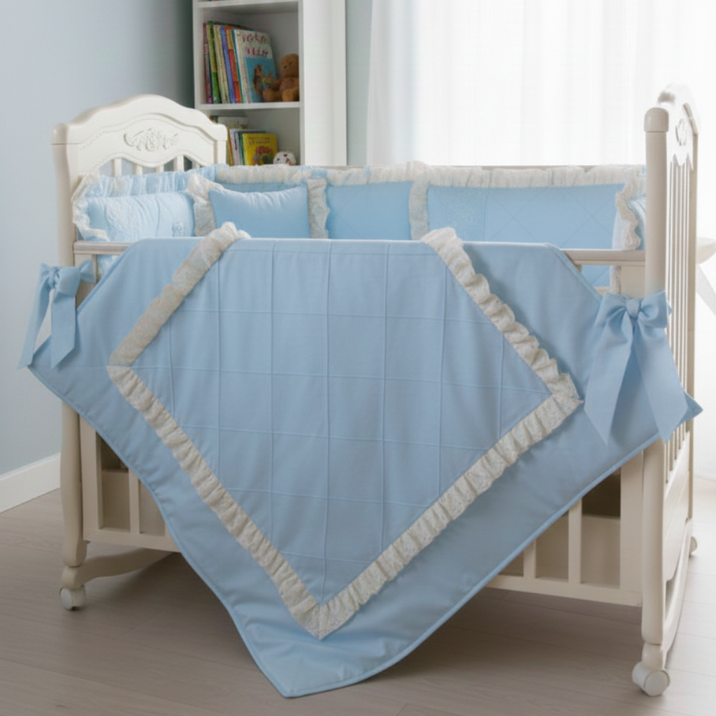 Create a soothing and elegant nursery atmosphere with this Premium Baby Blue Ruffled Crib Bedding Set. Designed with soft pastel blue fabric and delicate cream ruffle detailing, this set brings both comfort and charm to your baby’s space.